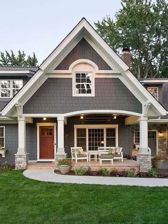 When building your exterior color palette, start by taking cues from the fixed elements of your home, such as the roof, stonework, brick, or landscaping. If your home has an expansive front lawn of greenery, a cool gray-color siding can make your surroundings pop.